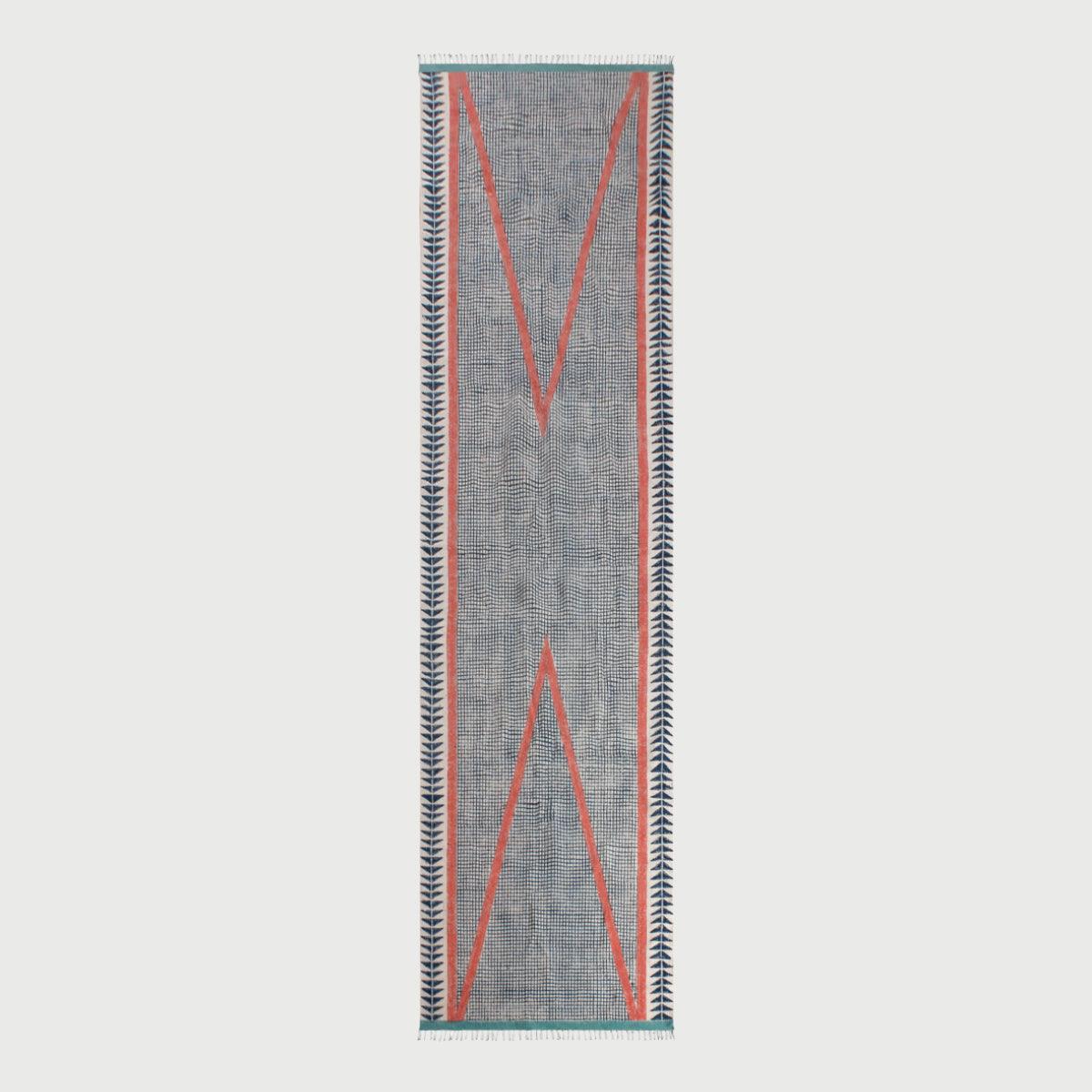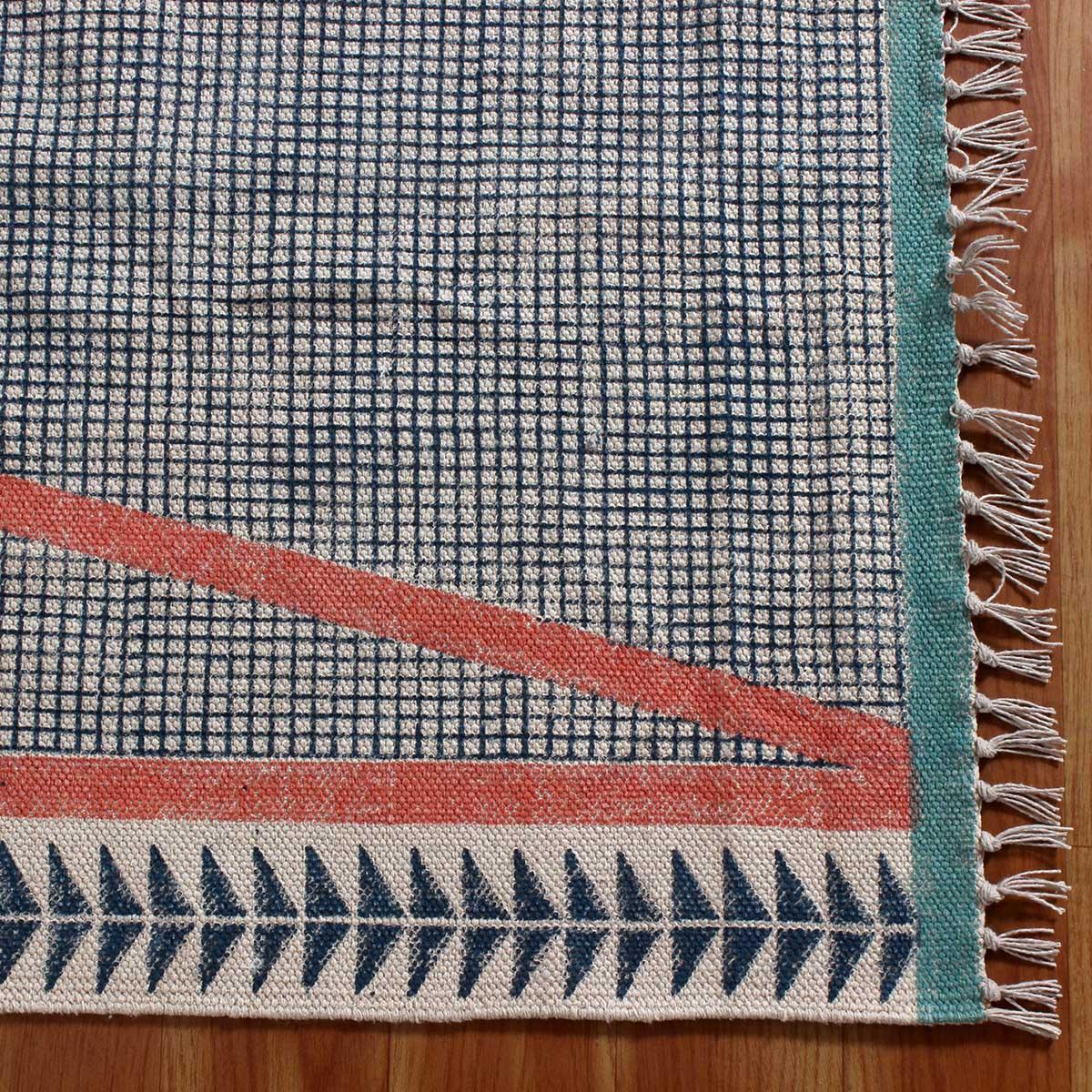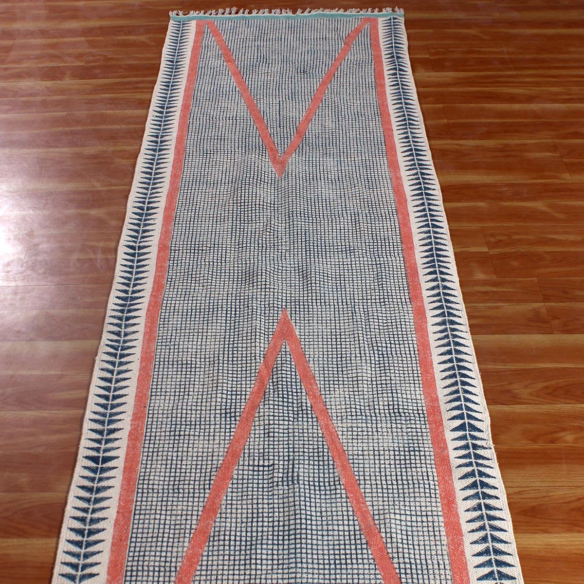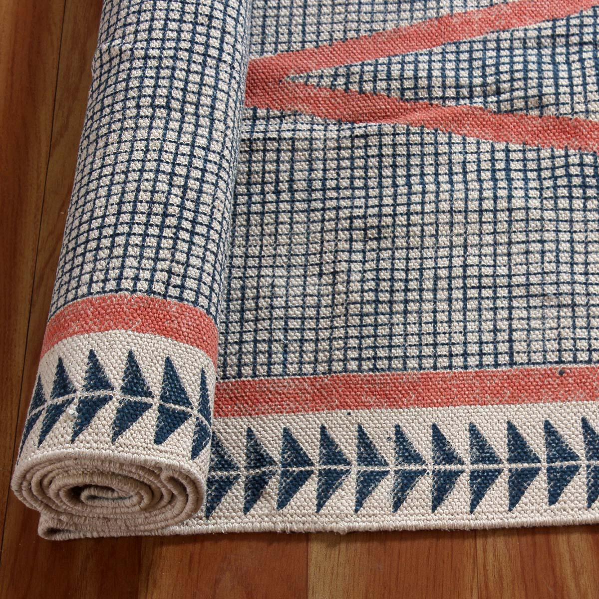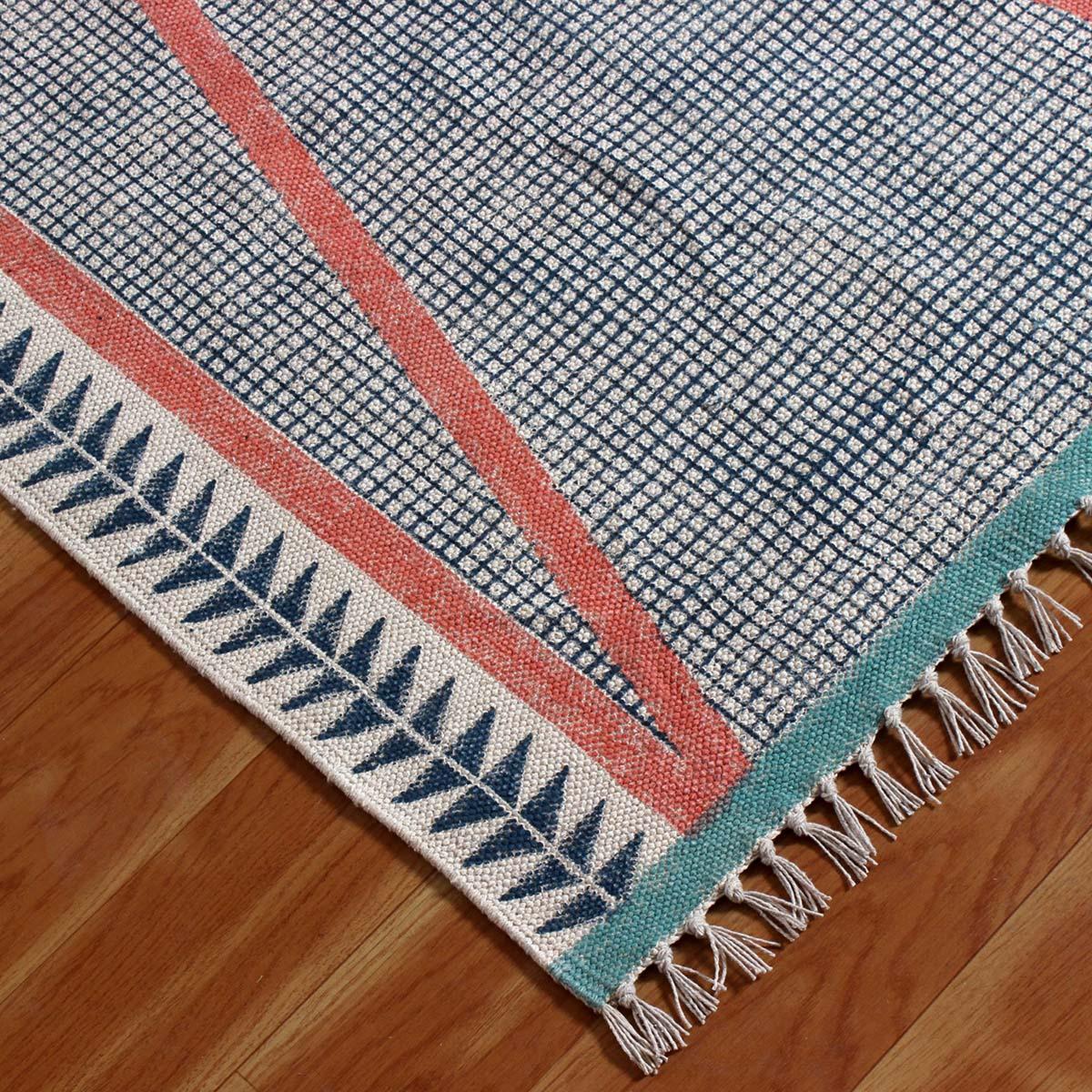Alfombra de algodón azul y rosa con estampado geométrico a mano para comedor