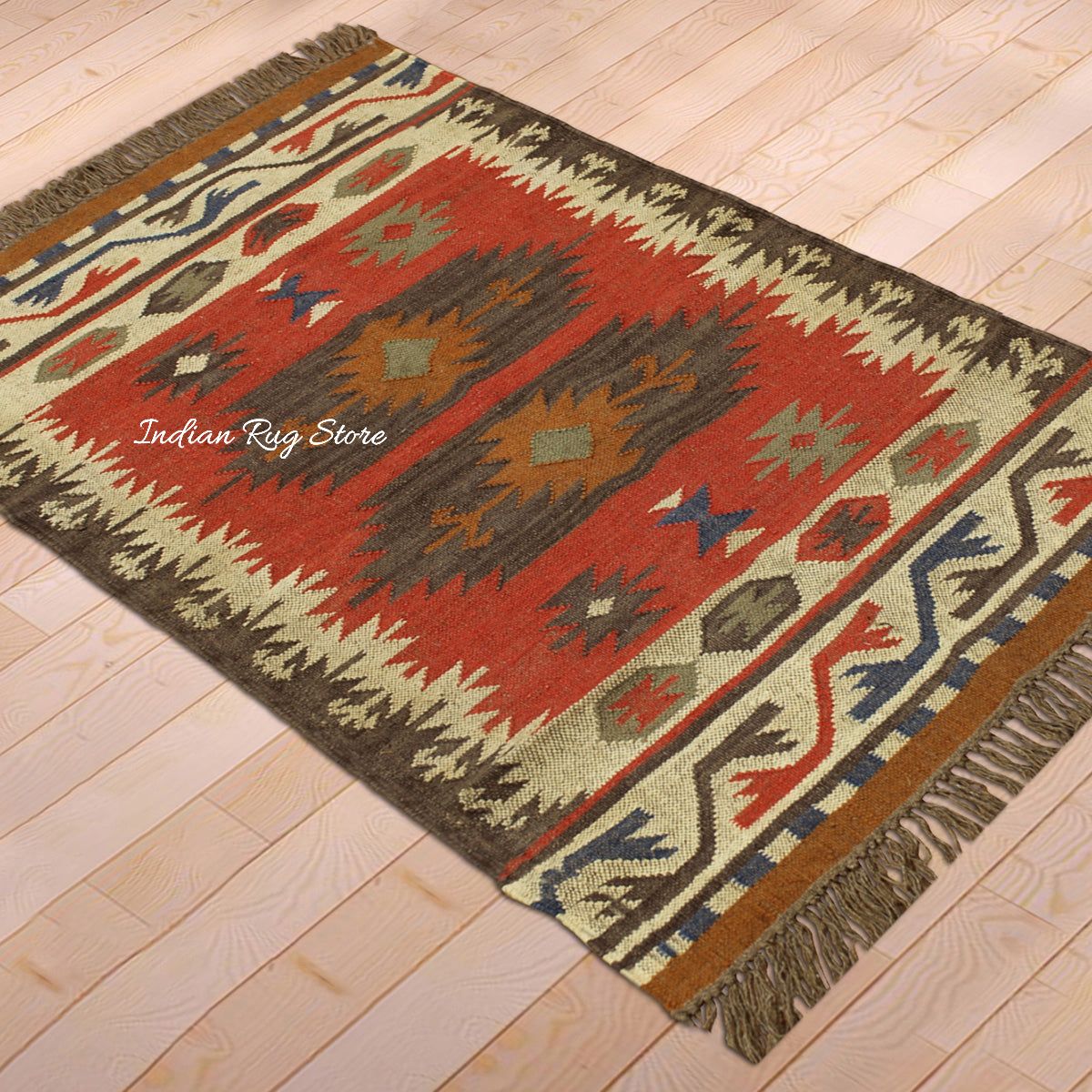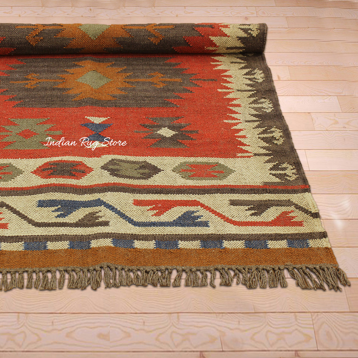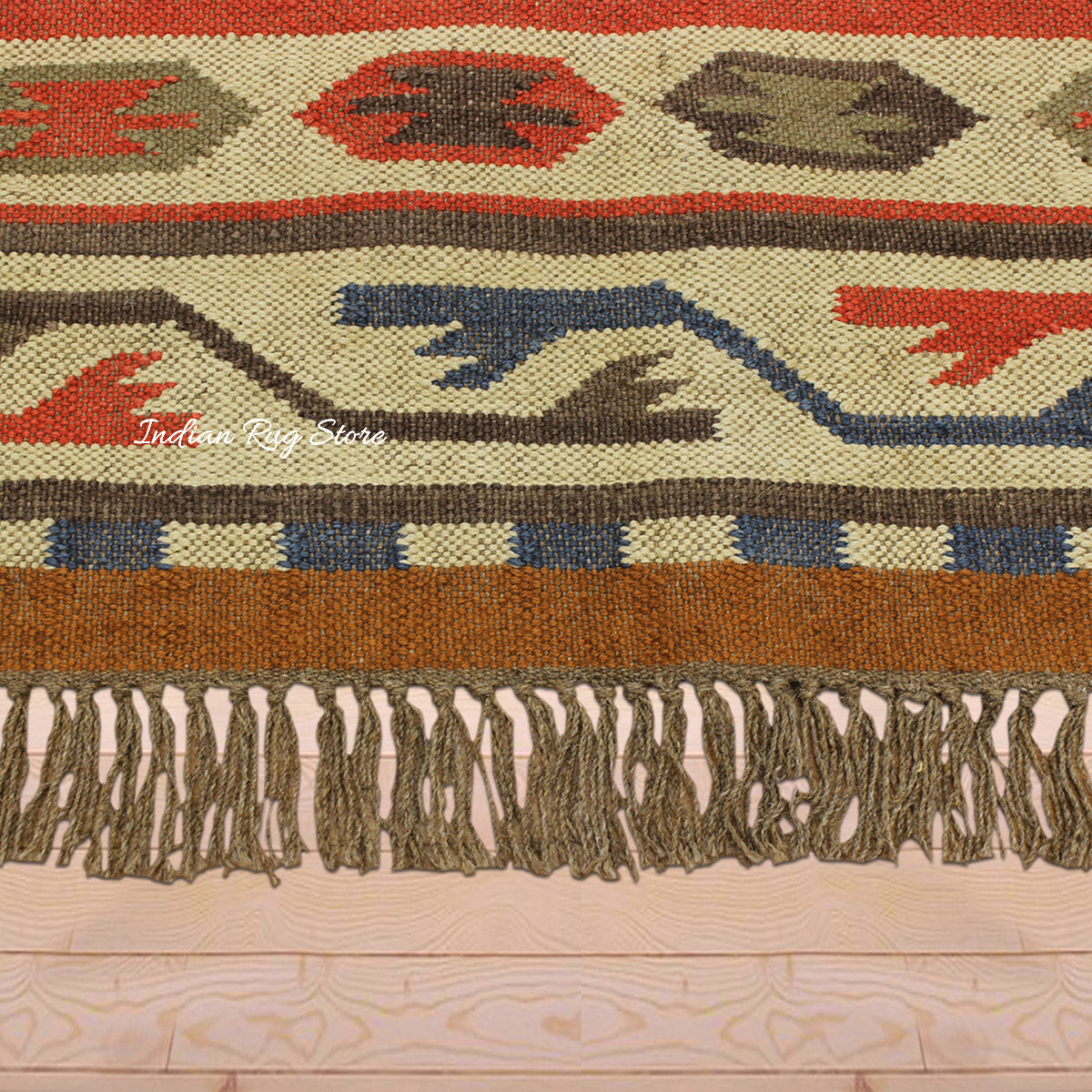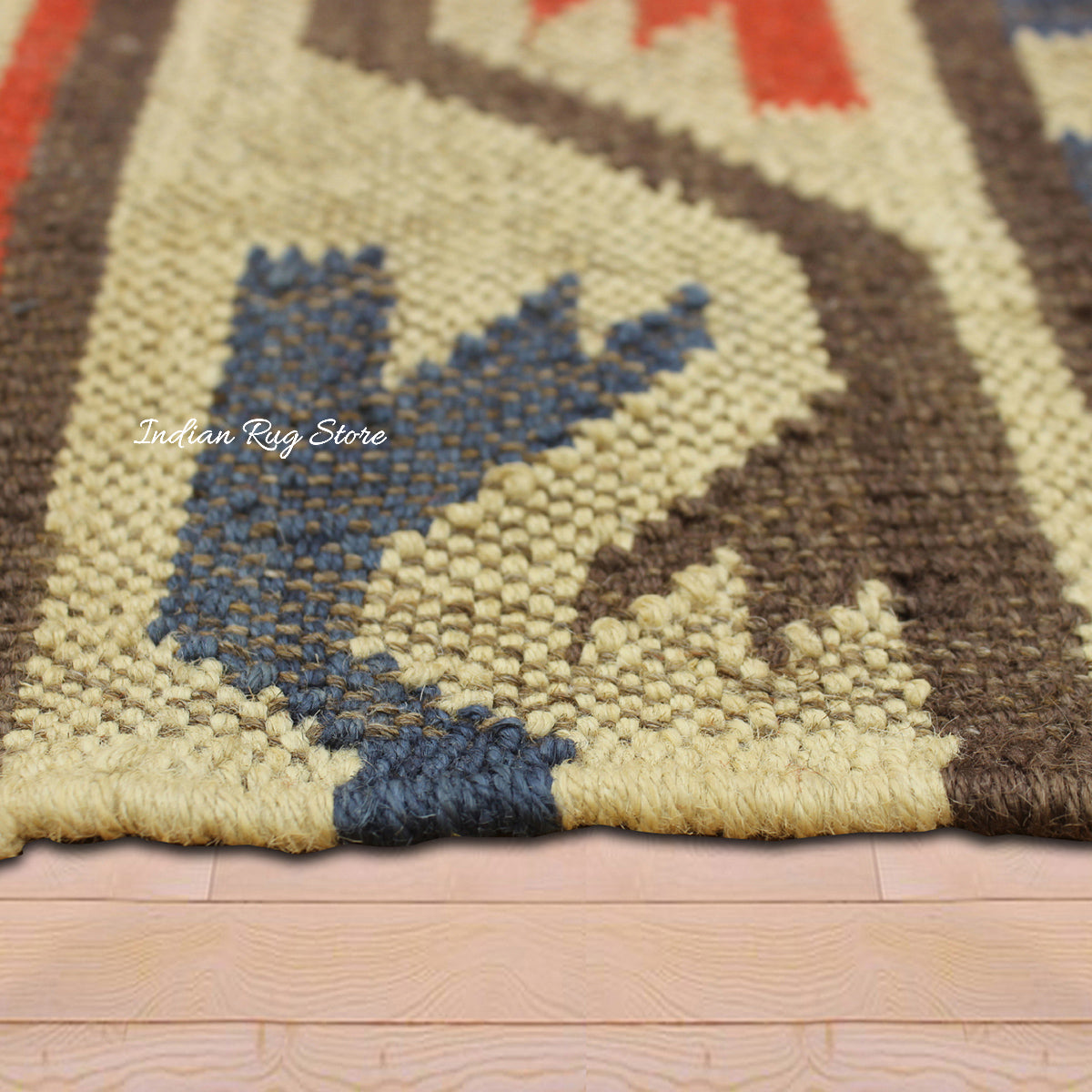 Alfombra india de yute y lana tejida a mano con motivos geométricos, multicolor y marrón