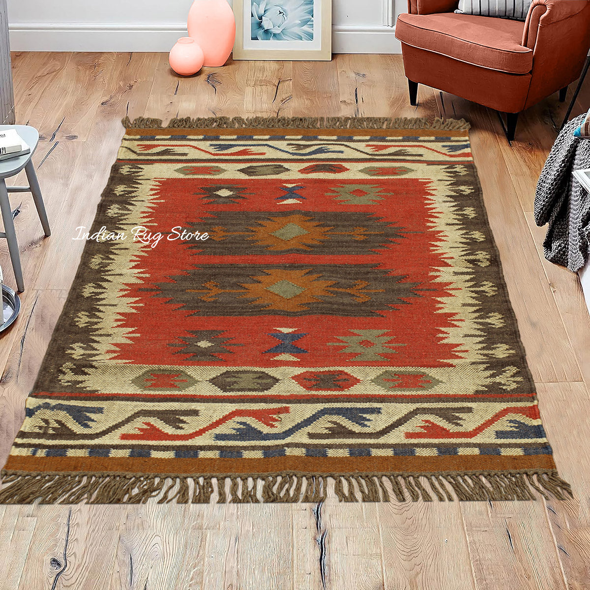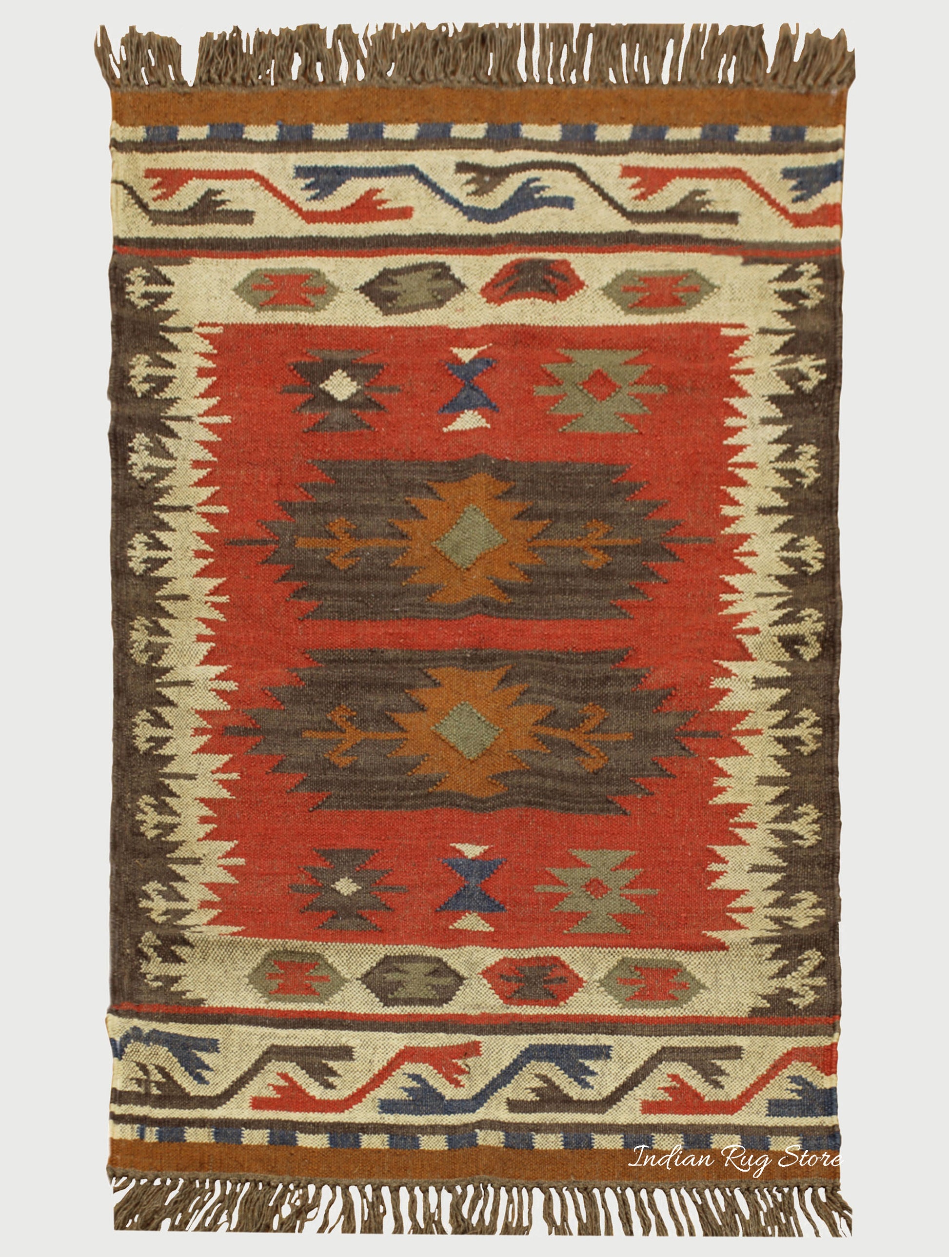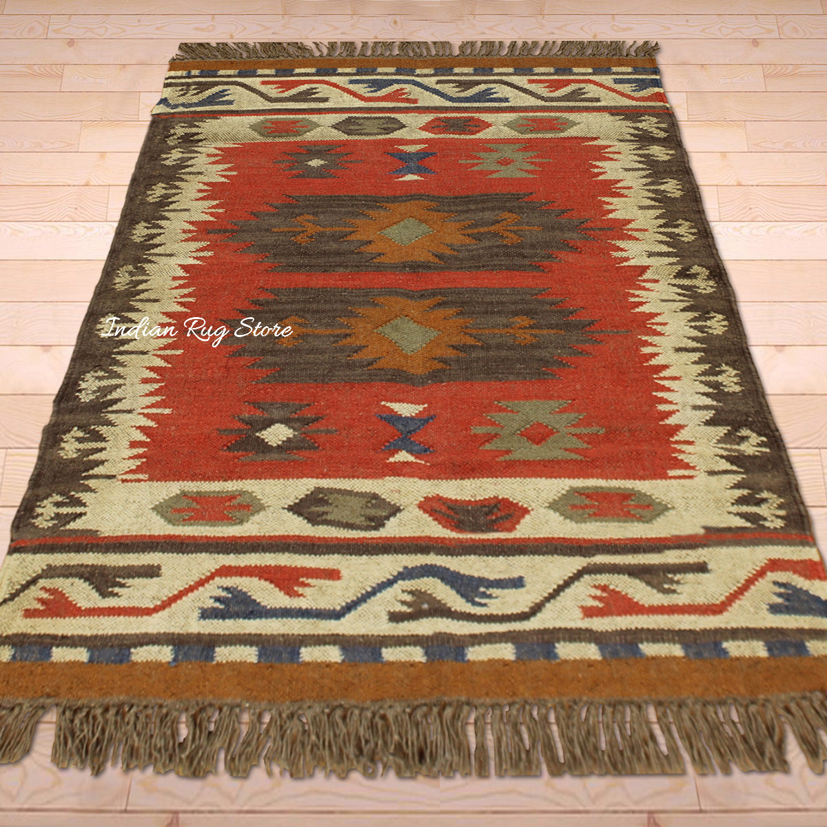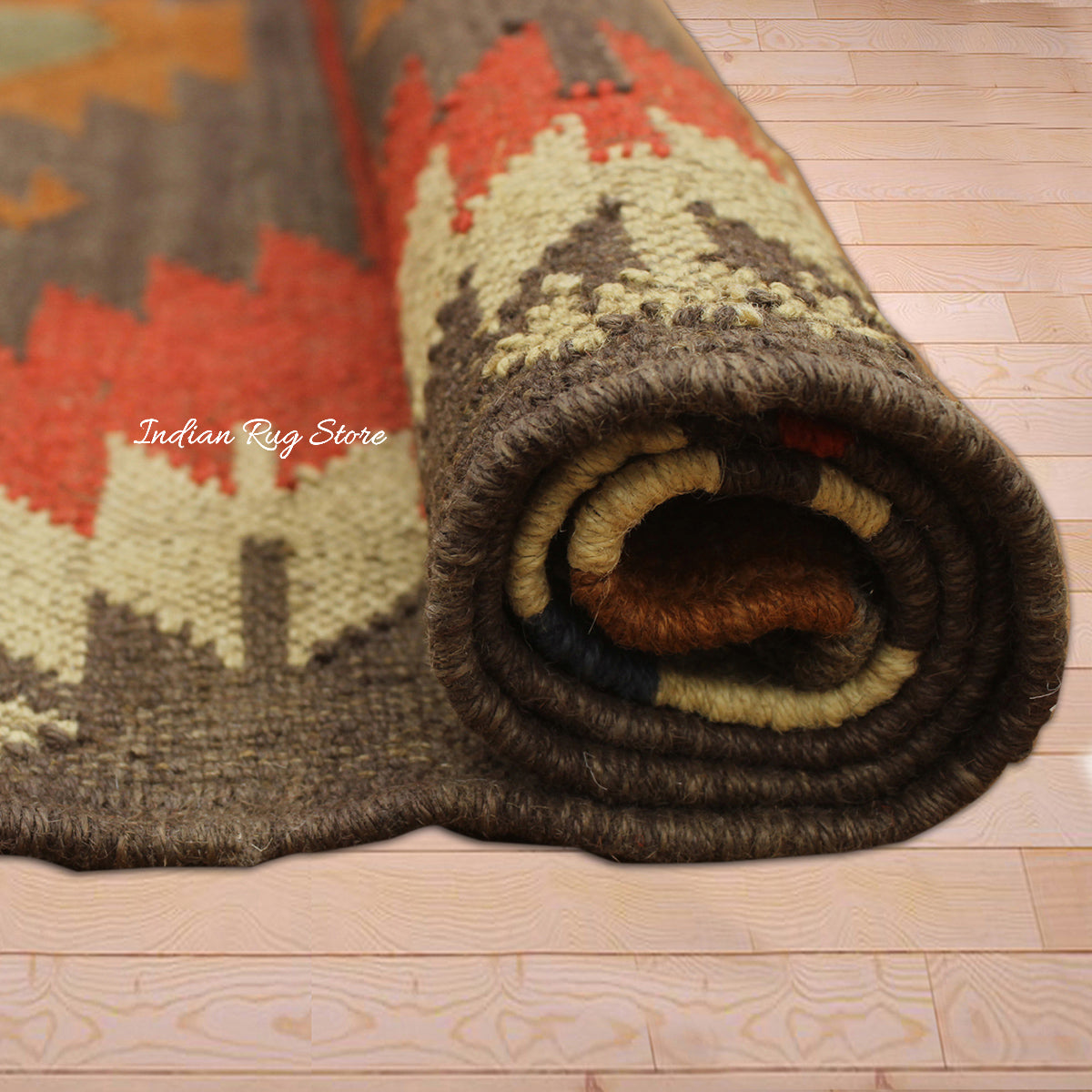Alfombra india de yute y lana tejida a mano con motivos geométricos, multicolor y marrón