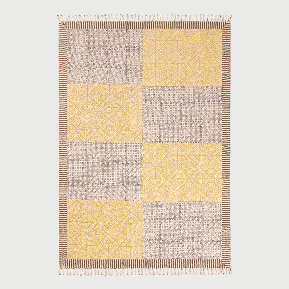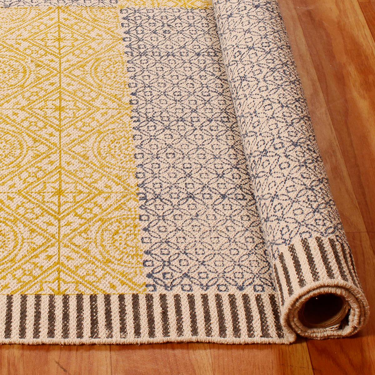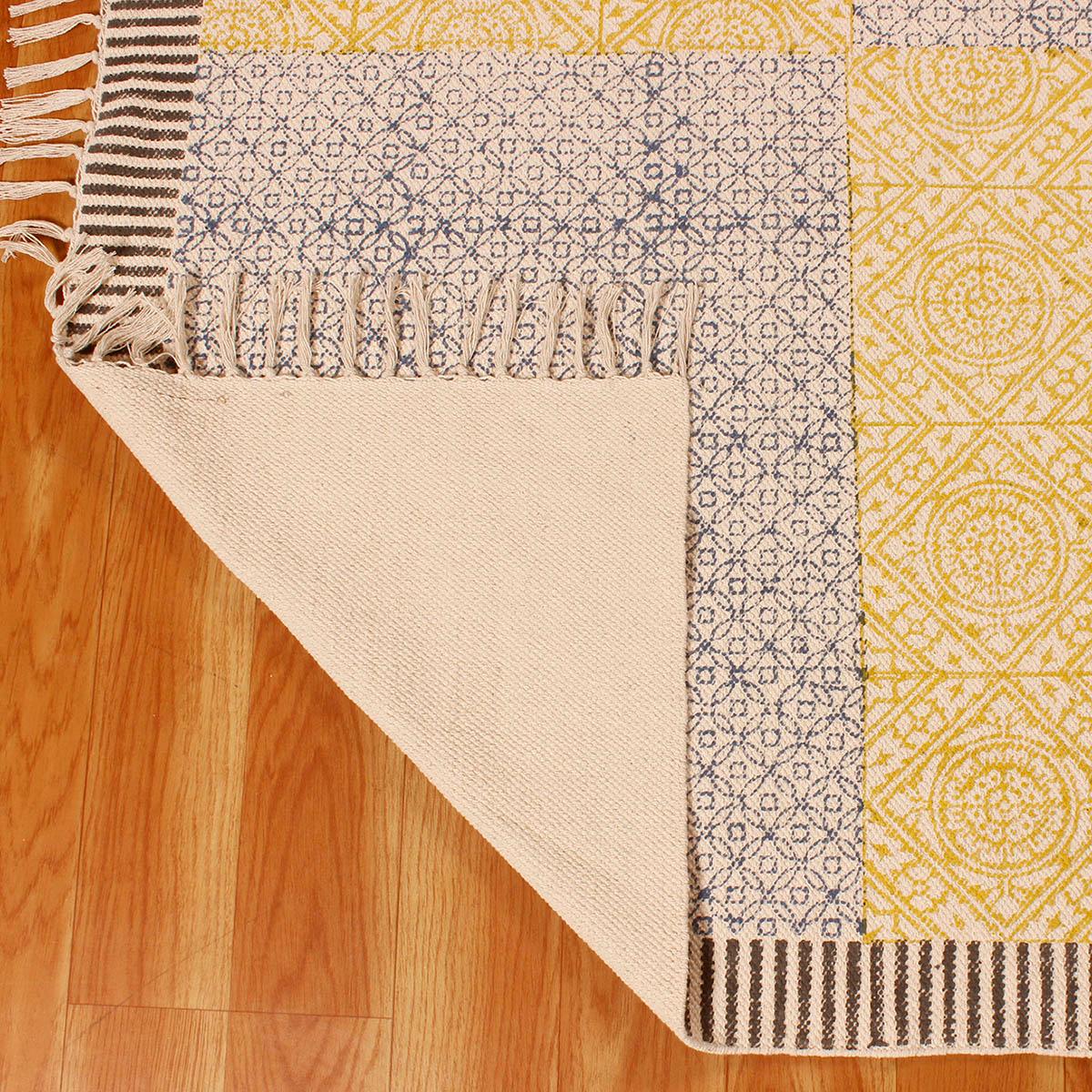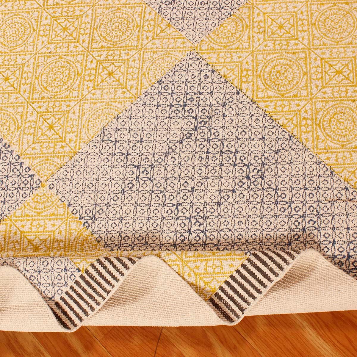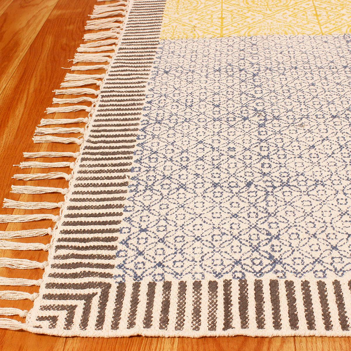 Tappeto da pranzo in cotone blu e giallo con stampa a blocchi geometrici