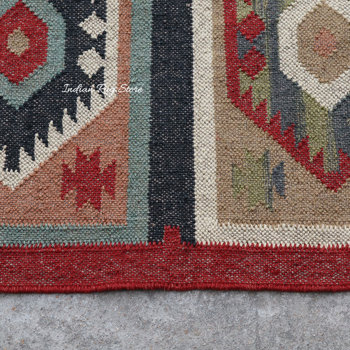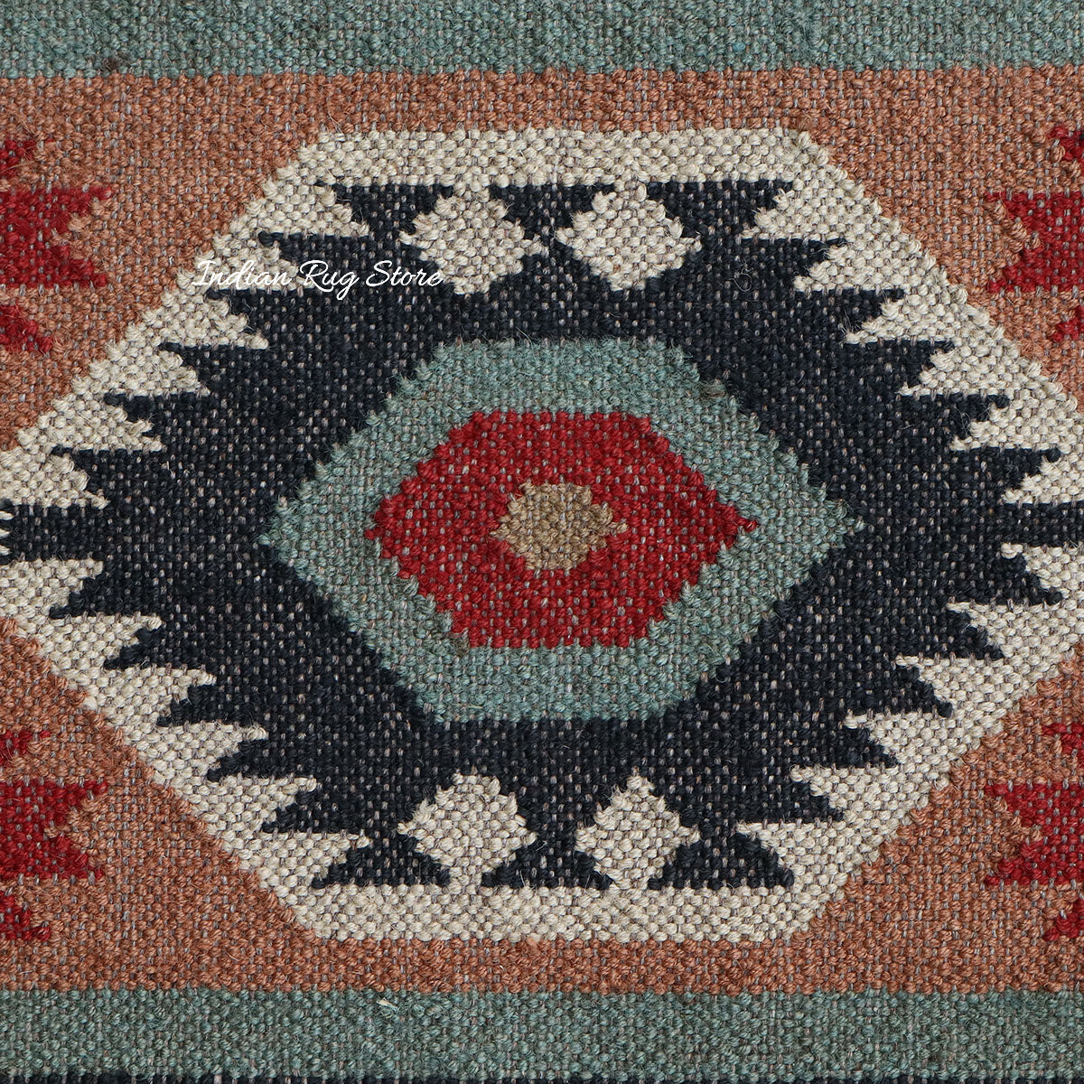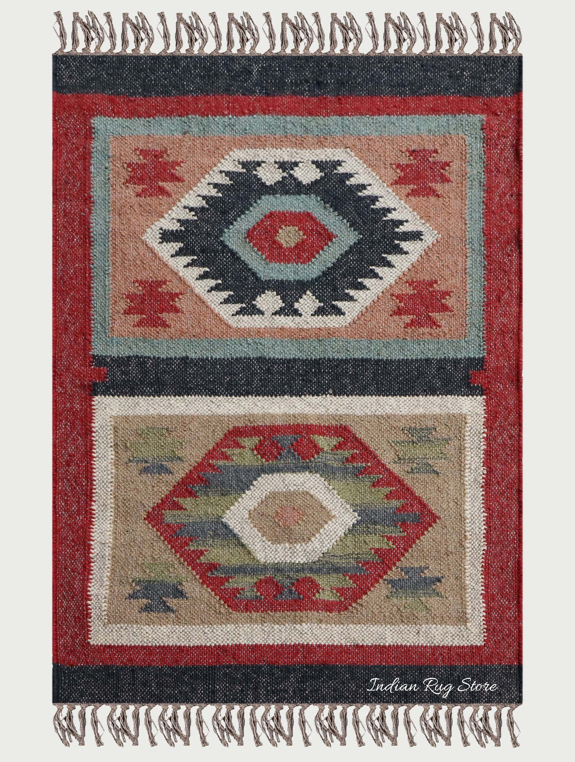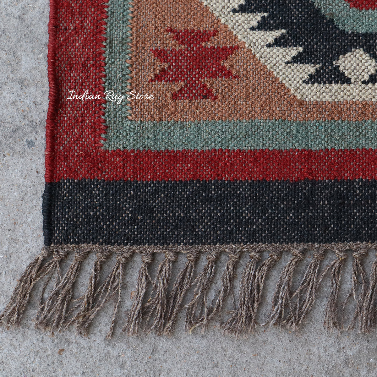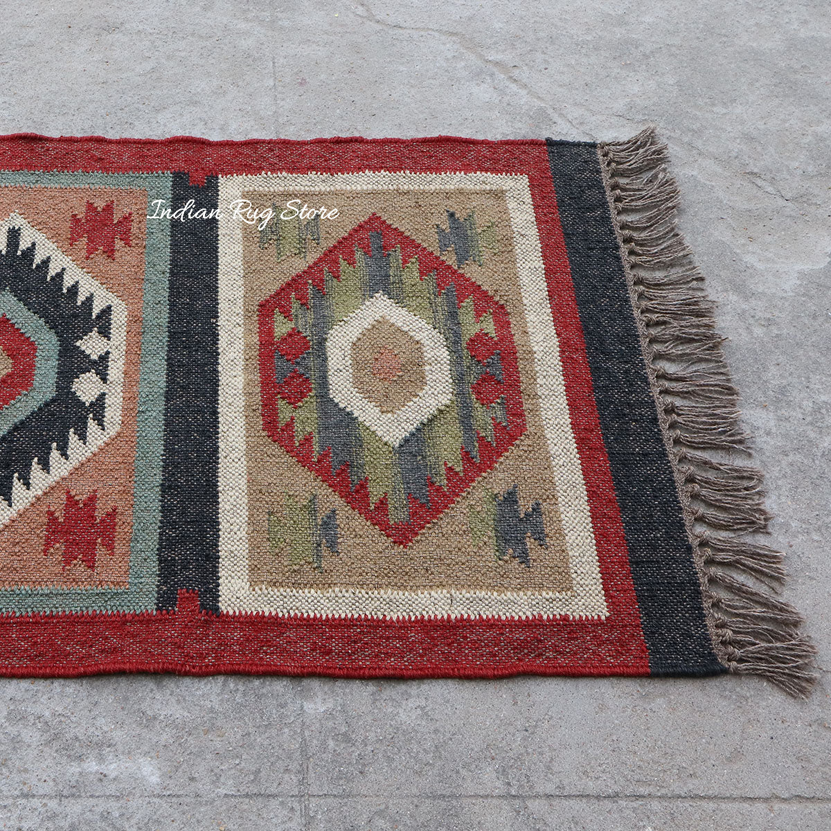 Tappeto da pranzo in juta di lana rosso bianco indiano tessuto a mano geometrico